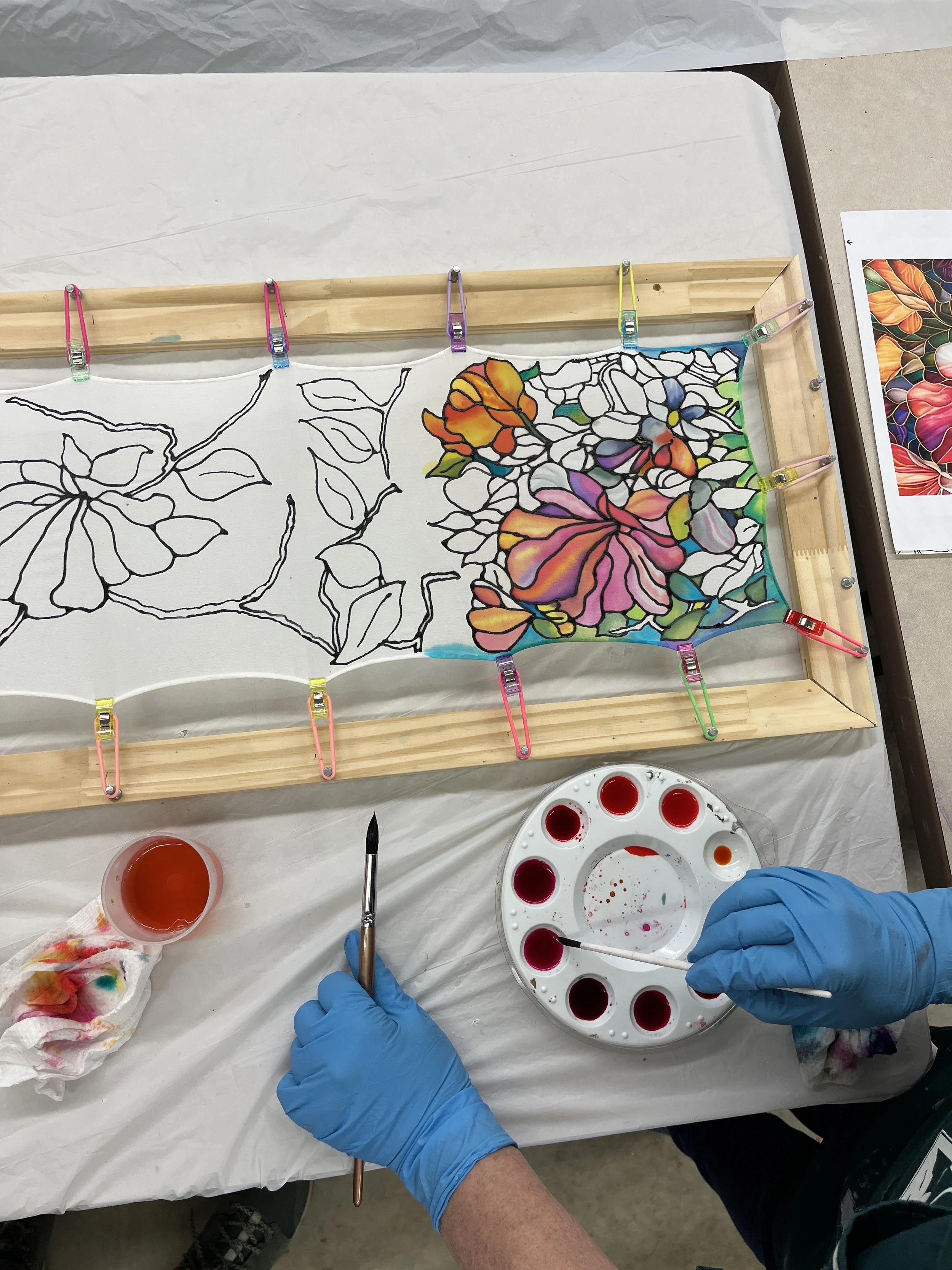 • You will finish painting your scarf but it will not be ready not take home that day. Your scarf will need to dry, and cure for 24-48 hours before it is steamed for 2-3 hours in a steamer. Then rinsed, washed, rinsed and ironed (by Tara).